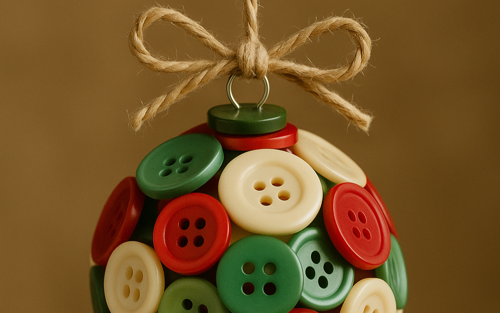 Infilando spilli o filo nei bottoni puoi unirli fino a formare una sfera compatta e colorata. Continua ad aggiungere elementi finché non ottieni la dimensione che desideri. Fissa un nastro nella parte superiore e appendi la pallina. È un’idea perfetta per riutilizzare bottoni spaiati che spesso rimangono nei cassetti.