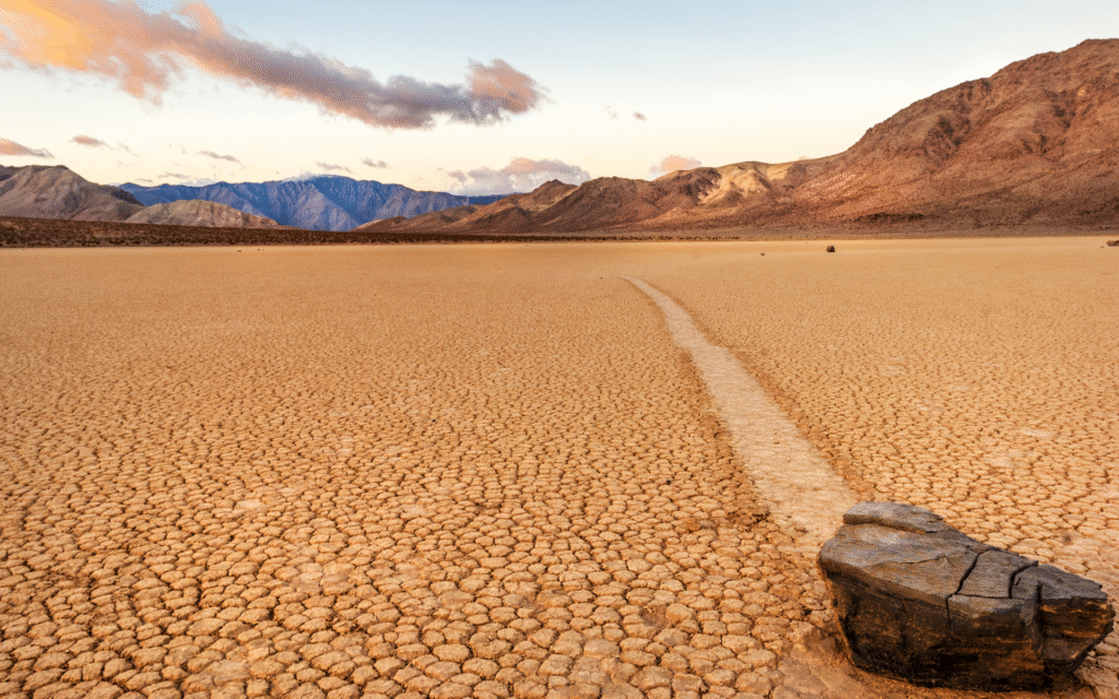 Il Racetrack Playa, un lago salato prosciugato situato nell’estremo nord-occidentale del parco, è il teatro di uno dei fenomeni più enigmatici del paesaggio californiano: le racetrack stones, pietre che sembrano muoversi da sole lasciando lunghe tracce sulla superficie argillosa. Per anni le teorie sono oscillate tra spiegazioni fantasiose e ipotesi fisiche complesse.