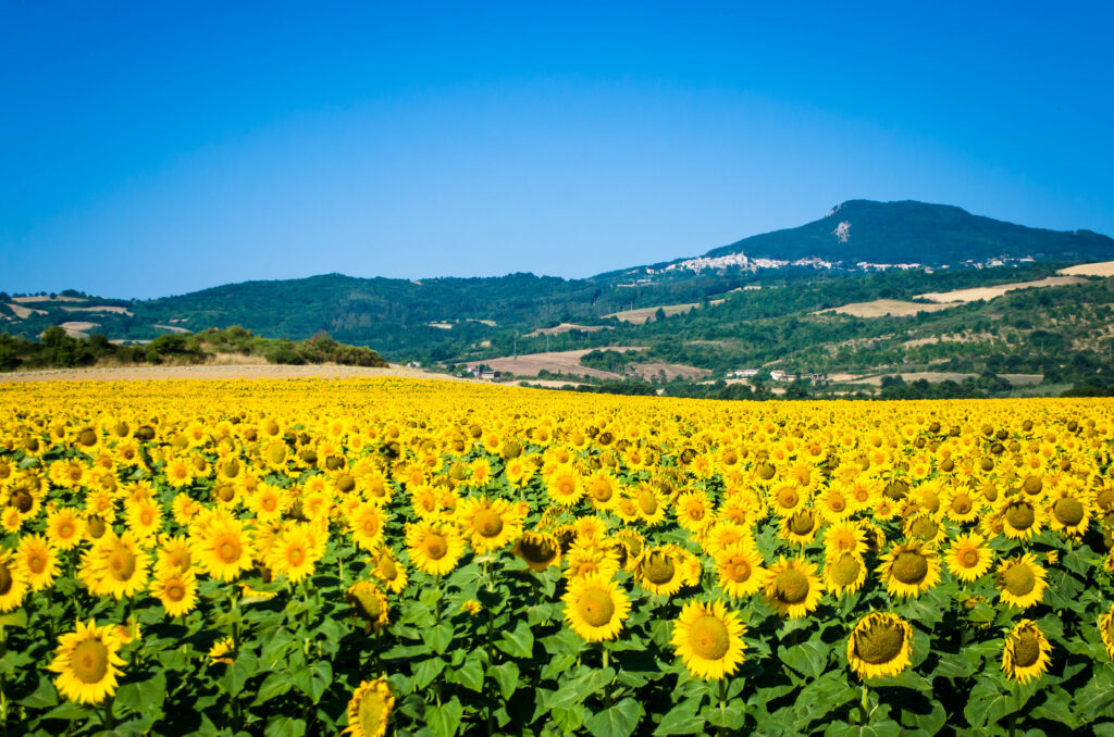 Percorsi cinque chilometri si lascia l’asfalto per una bella sterrata che attraversa una vallata piena zeppa di girasoli, un vero e proprio mare giallo in cui nuotare, e che poi inizia a salire lungo un bel crinale da cui si può ancora ammirare in lontananza la rocca di Radicofani.